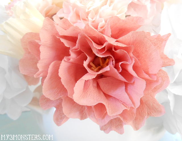 These peonies were my favorite of all the flowers I made. They were a little more involved because you have to make the stamen with embroidery floss and cut and shape each individual petal, but they are STUNNING! I think they are the flowers that "made" the arrangements. Of course, Martha Stewart's tutorial was the best for this flower. I adapted it slightly to make the more realistic stamen suggested here at Craftberry Bush. I purchased the crepe paper at Blumchen.com. That perfect rosy, coral-y color is called English Rose.
