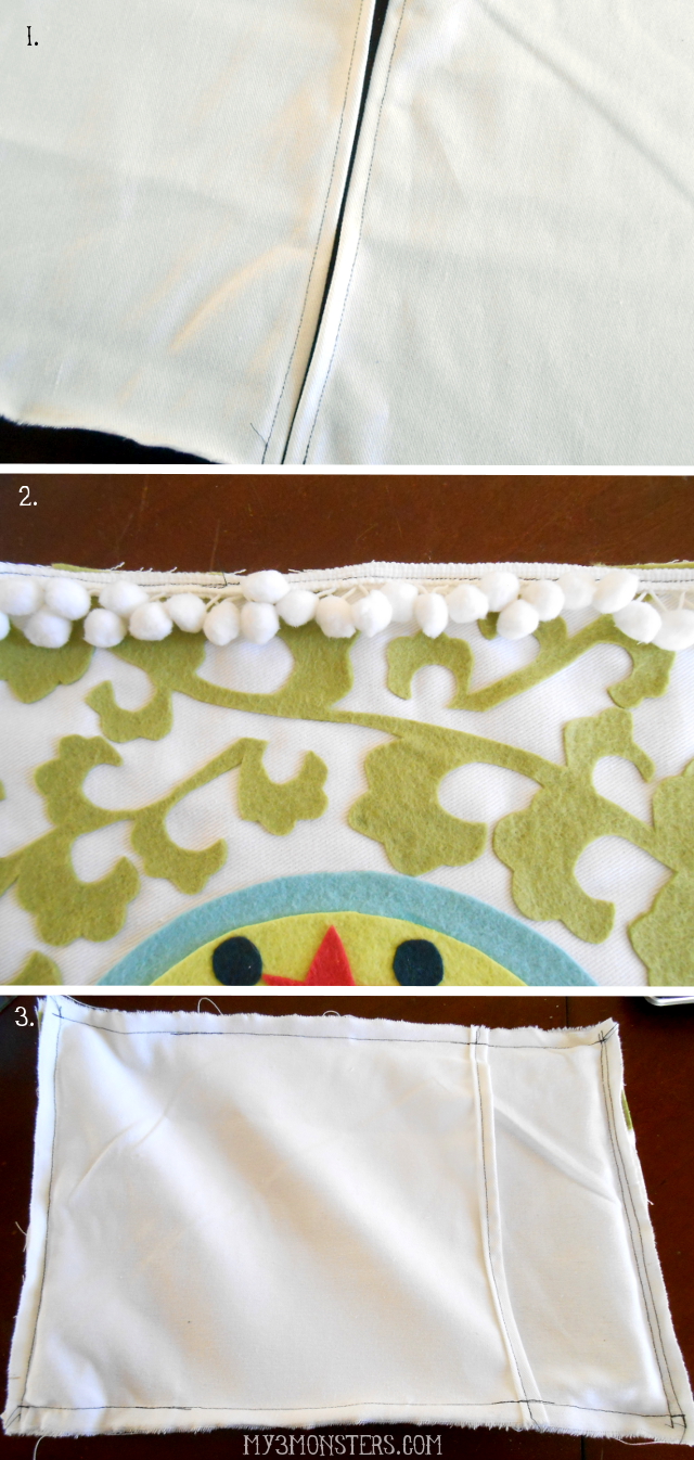 - Lay the front piece of your pillow cover flat with the right side up. Lay the two back pieces on top of it, right side down, overlapping the hemmed edges in the center. Line up the raw edges all the way around and pin in place. Sew around the perimeter of the pillow, making sure not to sew on top of the pom poms on each end. When you get to a corner, just lift up the presser foot on your machine and turn the fabric. I like to go back and re-sew the the top and bottom edges {the ones with the fabric overlapped} to make those seams extra sturdy. Don’t ask me how many times I have popped a seam trying to wrestle a big, puffy pillow into its cover….