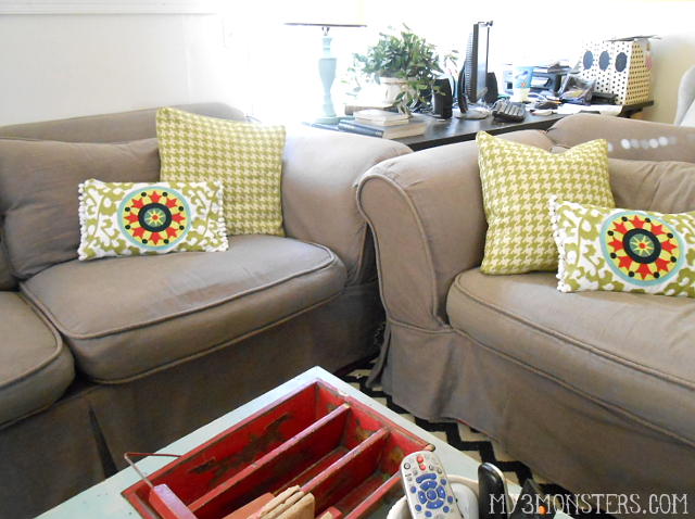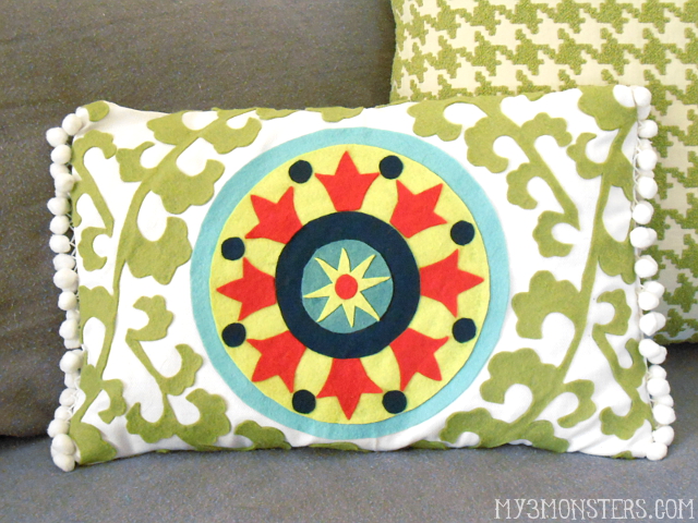 Hi guys! I made these Suzani-inspired accent pillows for my Craftaholics Anonymous post in March. They are the perfect addition to my living room to brighten the space up for spring. I wanted to