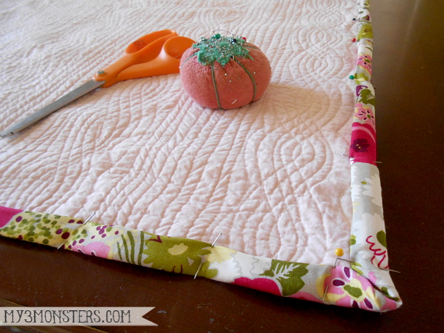 Lay the fabric out on a large flat surface with the backing fabric right side down and the quilted fabric right side up. Situate the quilted fabric so that you can see 1 inch of the backing fabric on each edge. {It should look like the photo above, except with a single layer of each fabric and the floral facing down, if that makes sense.}