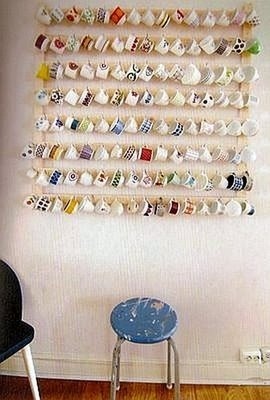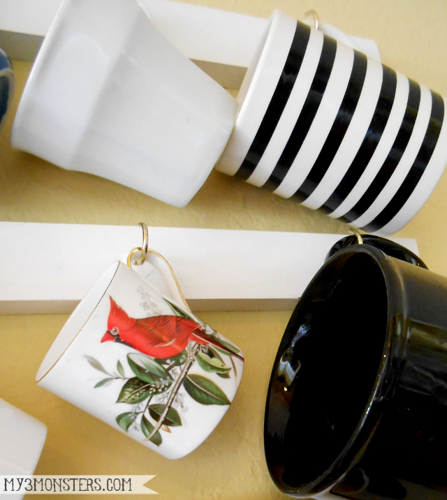 It was one of those love-at-first-sight, heart beating faster type decorating moments. What? You don't have those? I don't even know why I loved it so much. I'm not a tea drinker, for goodness sake! But I knew on the spot that I would one day try to replicate that in my home. I had the perfect spot in my dining room that was crying out for something more interesting than a chalkboard leaned up against the wall. For quite a while now I have been collecting cute or interesting tea cups from thrift stores, with just this project in mind. Several times my husband, the clutter sheriff, has asked me if we needed to keep "all these odd cups" or if he could donate them. I persevered and kept collecting. Finally, I hit the jackpot at Goodwill, where I found about 20 really great tea cups and mugs in one trip, and I knew I was ready to take the plunge!