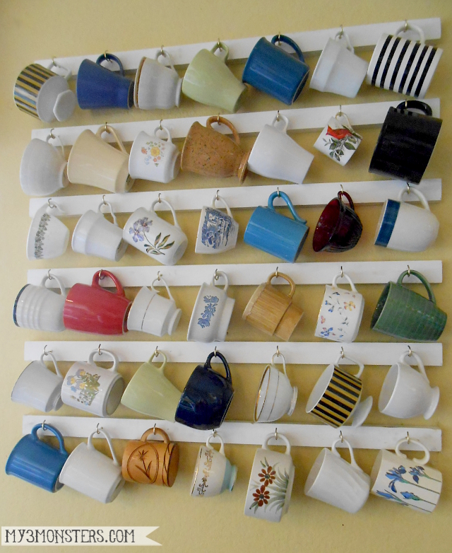 To give it a nice, finished look, countersink the screws into the slats so you can cover the holes with wood filler. After sanding and painting you won't even be able to tell where the hardware is. The hardest part of this project was removing all the price tags from the cups -- I worked on that for a good long time, while the wall hangers came together in about 30 minutes or so.