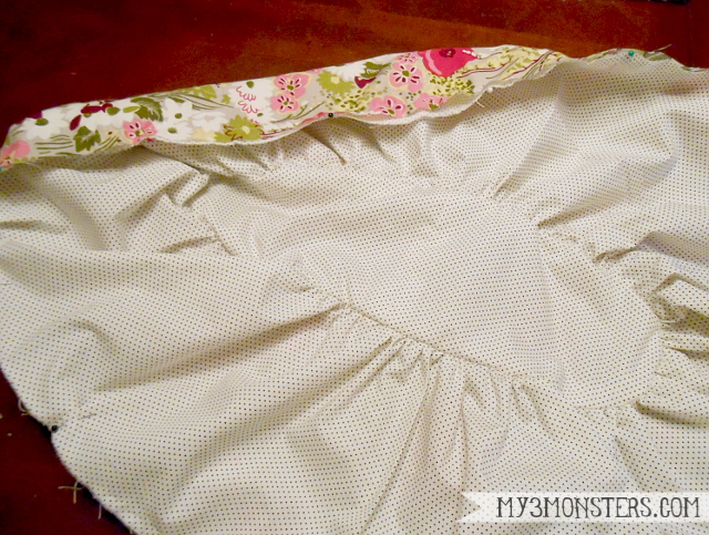 Gather the fabric evenly so that it fits around the BAG BOTTOM piece. Pin it right sides together, and sew in place.