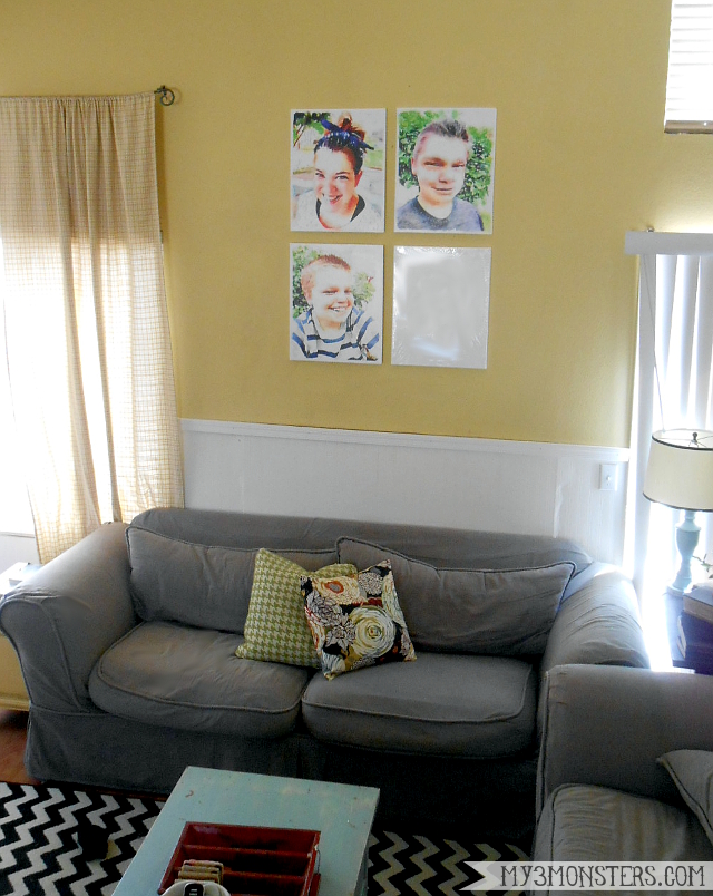 Hello, friends! I am slowly, but surely, giving my living room a little facelift. We've had our Funky Typography artwork hanging up in there for several years, which is awesome, but I was more than ready for something new to look at every day. I've never been good about using family portraits in my decorating. I'm not sure why . . . I just kind of figured if I wanted to see my kids, I could just . . . look at them. Or something. I never claimed to be mother of the year, folks.