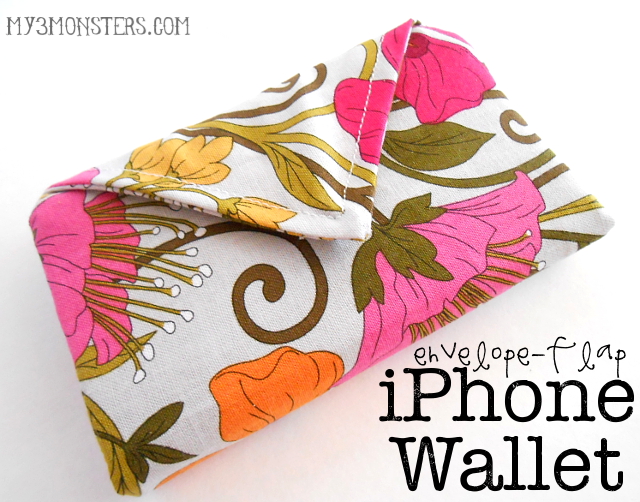 Hi guys! My old iPhone wallet has gotten worn out, so I finally broke down and made a new variation on the original pattern. I had this really cool fabric from Wholeport again -- another Vera Bradley print that I love -- which I thought would be perfect for a wallet. Of the three iPhone wallets I have made, I think this one is my favorite. I love the simple style of the envelope closure. If you have about 1/4 yard of a favorite fabric, you can make one of these wallets, too, in less than an hour!