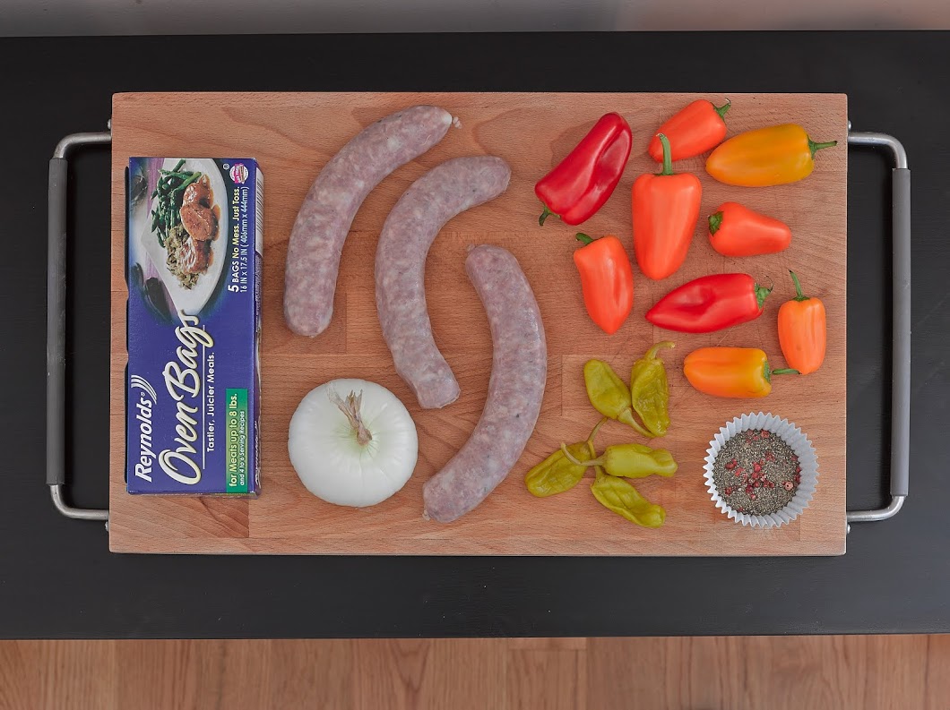 {source: ReynoldsKitchens.com -- this is made almost exactly the same way as the fajitas -- just swap out Italian sausage for the chicken and use your favorite kinds of peppers!}