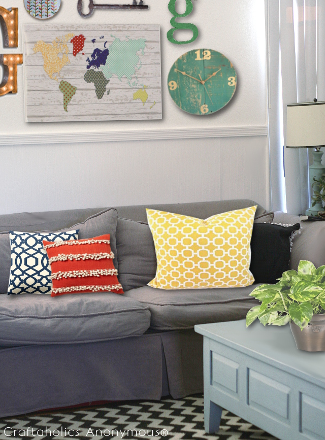 Hi guys! Today I'm sharing my last project over at Craftaholics Anonymous as part of the creative team. *sniff, sniff* It's a little bit sad. This year has gone by so quickly! As my "last hurrah" I designed this printable world map that looks like the trendy pallet art you'll see all over Pinterest. As an added bonus, you get the Photoshop makeover of my living room to see how I'll be using this printable in my home!