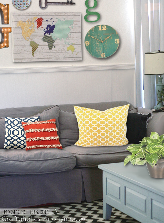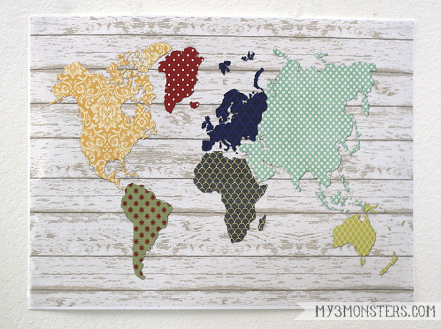 Since we painted our walls white this fall I have been working to add colorful, fun accessories to our home. I decided a big patchwork-style world map would be a perfect anchor piece for a gallery wall above the couch in the living room. Get your pen and paper because here are the complex steps: