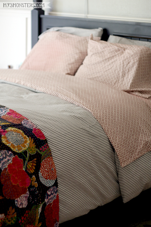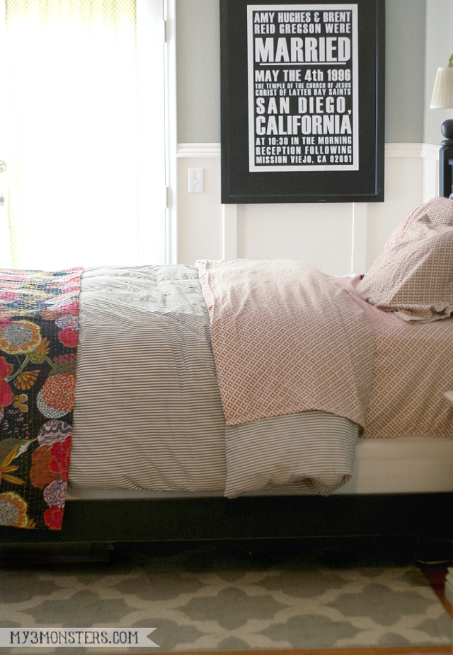 {Forgive me for not putting our bed skirt back on before taking these photos . . .The bed, she looks a little naked on the bottom. Oops. And pretend I smoothed out that duvet cover better, mmmkay?}