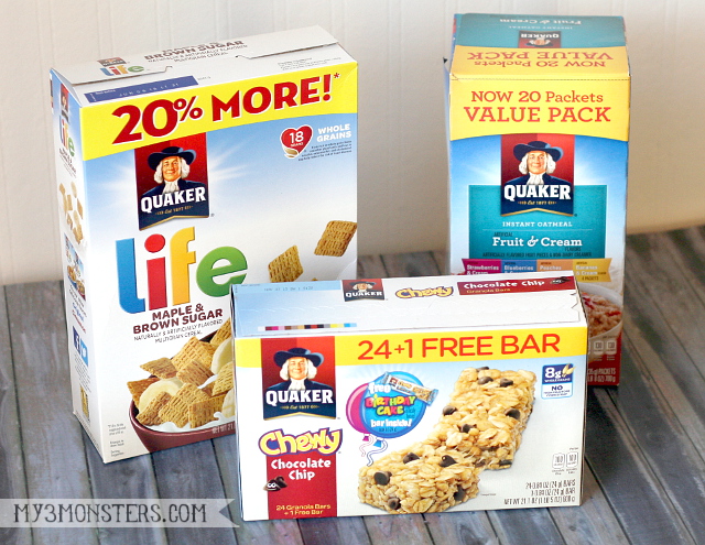 When we go to Walmart to stock up on school supplies, these are a few of our essentials: Quaker Fruit & Cream Instant Oatmeal, Quaker Chewy granola bars, and Life Maple and Brown Sugar cereal.