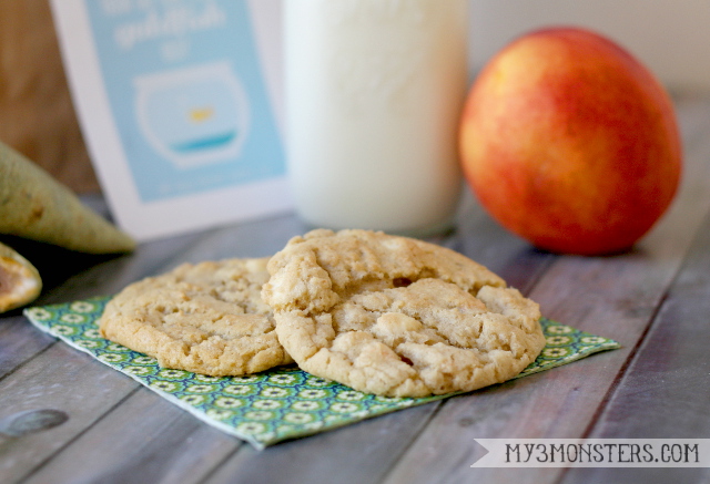 My kids will actually eat breakfast in the morning if we have Life cereal and/or Quaker Instant Oatmeal pouches in the house. For lunch, a Quaker Chewy granola bar is a no-brainer for tossing in the old brown bag with a turkey wrap and a piece of fruit. While granola bars are always a crowd-pleaser all on their own, nothing gets my kids more excited than finding homemade cookies in their lunches when they get to school. This year I decided to surprise them on the first day with a special treat – Peaches n’ Cream Oatmeal Cookies. It’s a yummy twist on traditional oatmeal chocolate chip cookies, with a subtle peachy flavor and white chocolate chips.