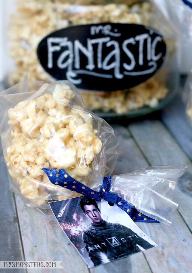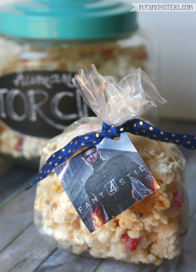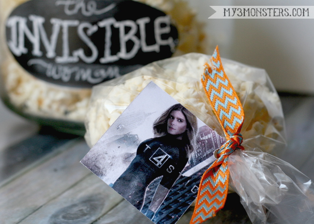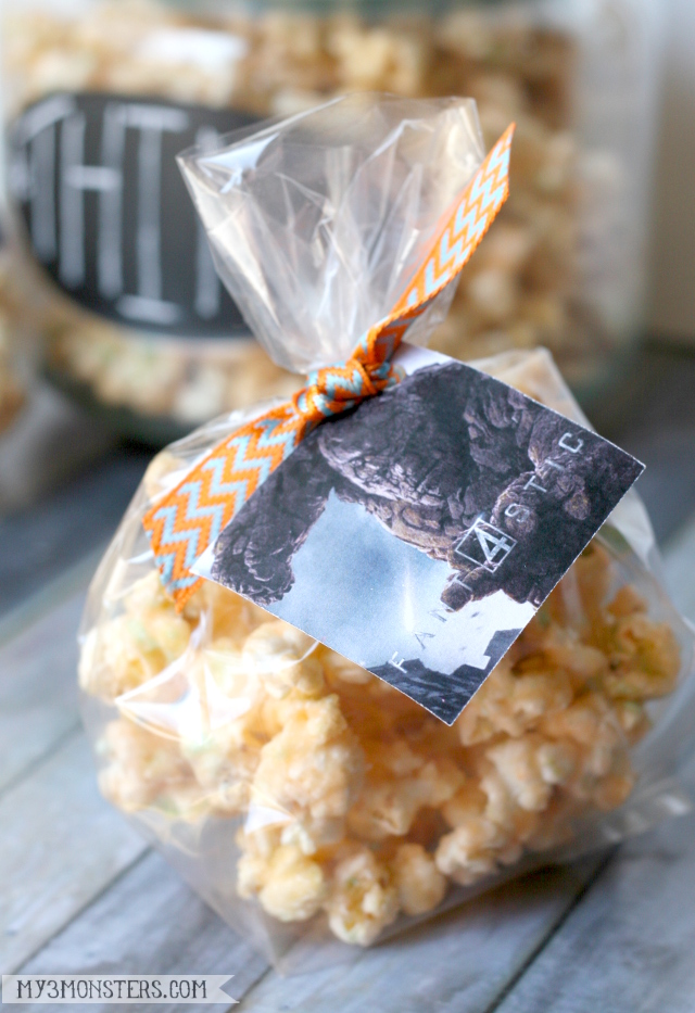 I designed these two-sided tags to be attached to small cellophane bags of flavored popcorn. Dowload the pdf file from my Dropbox here. I simply printed the tags in color onto card stock, cut out the squares and glued them back to back, with the logo on one side and the character on the other. Then I punched a hole on one corner and tied them to the tops of the bags with ribbon. I kept my bags of popcorn on the small side because I knew many people would want to sample more than one {if not all} of the flavors. Attach the picture to the flavor of popcorn that represents each character, or randomly attach to bags of plain, buttered popcorn.