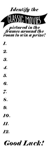 We found mirrored frames at the dollar store and filled them with iconic images from classic movies found on the internet. To get our guests mingling, we made a game of identifying the movies represented by the images. The person who can correctly guess the most classic movies will win a pair of movie tickets! {My daughter and her friend are taking Film Study this year in school, so they may have an unfair advantage...}