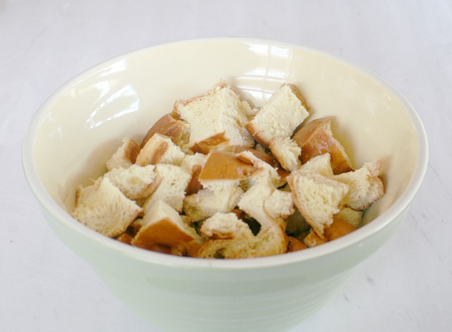 Begin by cutting your challah into approx. 1-inch cubes and placing it in a large bowl. {Actually, a larger bowl than this one – I ended up using two bowls this size.