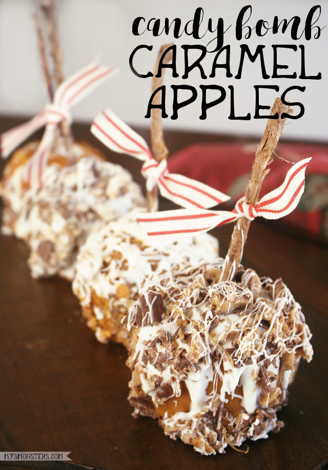 Hi, guys!! I have a pressing concern on my mind today. A question for the ages -- Why do we only eat caramel apples in the fall?! They’re so yummy. The perfect balance of sweet and tart, healthy and …. not healthy. I always forget HOW MUCH I like them until September/October rolls around and I start seeing them all over the craft and food blogosphere and simply MUST have one. You guys, they’re delicious with a capital D. Especially when you roll ‘em in white chocolate and the equivalent of a chopped up full-size candy bar. {Maybe that’s why they are a once-a-year indulgence!} Need a great way to use up your leftover Halloween candy next week? I got you. Make a few of these “Candy Bomb” caramel apples.