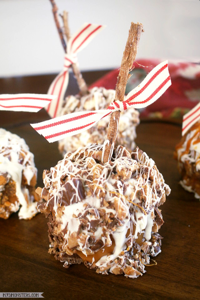 Your next layer will either be white chocolate or candy depending on how you want your finished apple to look. For a few of mine, I dipped the whole apple into white chocolate then sprinkled the candy evenly over the top and around the sides. Finish it off with a light drizzle of more white chocolate or caramel – or both. The Twix apple shown above was done this way.