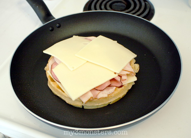 Add another waffle and butter the top. When the bottom of your sandwich gets nice and golden and crispy and the cheese starts to melt, flip it over and let the other side cook. I found that my outside got crispy before the center of the sandwich was as warm as I like it. (I put a lot of filling in that bad boy!) No problem – just pop it in the microwave for about a minute and the cheese gets all warm and gooey. If you’re worried about losing the crispness in the microwave, you could construct your sandwich, heat it up first, and then add the butter and grill it in the pan. I didn’t find it was a problem.