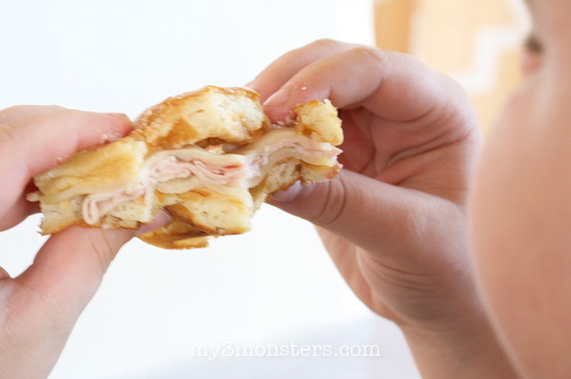 Give it a nice, heavy dusting of powdered sugar and it’s ready to serve. You can serve it sandwich-style with a side of jam or berry syrup for dipping. My boys really liked it that way, which is more like a traditional Monte Cristo.