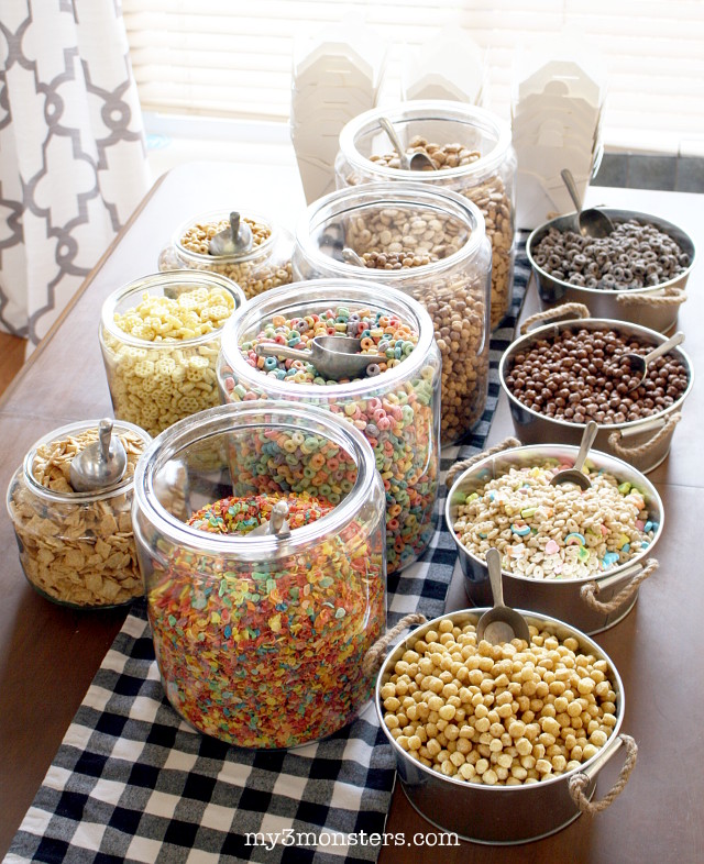 For your party, set up a buffet table full of a wide variety of cereals, toppings, and milks – some sweet, some healthy (if that’s your thing).