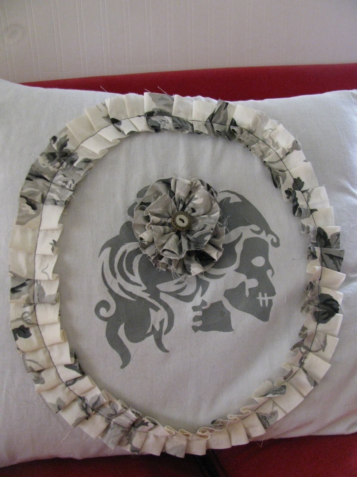 If your pillows are smallish, you could probably stop there. Mine are kind of big and the design still looked too . . . unfinished or something. I took an oval frame that I had and lightly traced around it in pencil on my pillowcases. Then I took 2" wide strips of my coordinating fabric and made little pleats and pinned it all along my pencil line. I just sewed a straight stitch right around the middle of my ruffle to attach it to the pillowcase. The edges of the fabric are unfinished so they will fray over time and add to the look. To finish off the pillow covers I simply shortened the pillowcase to the desired length and added some gray ribbon ties on the open end to close it up.