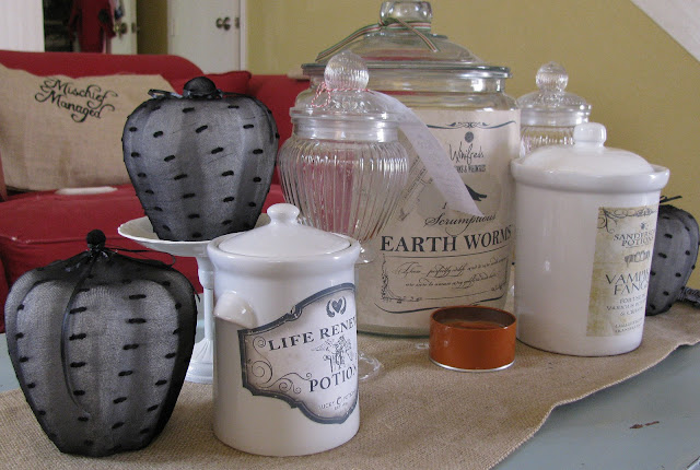 I adore this pumpkin from Better Homes and Gardens. I like white pumpkins so much better, but my children always pick the classic orange ones. Traditionalists. I get it. It's fine. But white pumpkins? Covered in black lace? Yes, please. Let the kids carve up the orange ones. Real pumpkins are just starting to come into stores here and I always hesitate to buy them so early because of the heat. I'm afraid they wouldn't last. It's a silly fear, really because I keep them in the house. I bought a few paper mache pumpkins on clearance a few years back thinking I would do something with them. Alas, they have sat in the fall decor box in the garage unused...unappreciated...nearly forgotten. And then a few weeks ago I bought some black patterned tights at Target. {This ties in to the whole story, I promise.} I was excited to wear them the following Sunday morning {yes, it's too warm for pumpkins, but not for tights -- I'm an enigma}, but when I took them out of the package I could see two huge holes -- one in each leg -- that were clearly going to run the moment I stretched them. Boo. I guess I could have returned them, but, like the pumpkins, I had bought them on clearance and it just didn't seem worth it to go all the way back to the store for a mere $1.50. It was then that I remembered this pin and those pumpkins in the garage and a project was born. Before I show you mine I have to tell yoou I don't really like how mine turned out, but I'ma keep it it real here y'all. I'll show you all my failures right along with my successes. You win some, you lose some. The shape of the pumpkins is odd and the polka dot tights I used are not nearly as pretty as the lace ones in the inspiration. See for yourself: