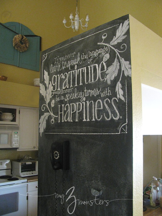 Beautiful! I googled Thanksgiving chalkboard and yours came up, so much better than a turkey on the chalkboard! I love it! Thank you for sharing, I just put on my chalkboard in my kitchen this morning. It's a good reminder for all that we really do have a lot to be thankful for despite setbacks we may have had. Happy Thanksgiving!