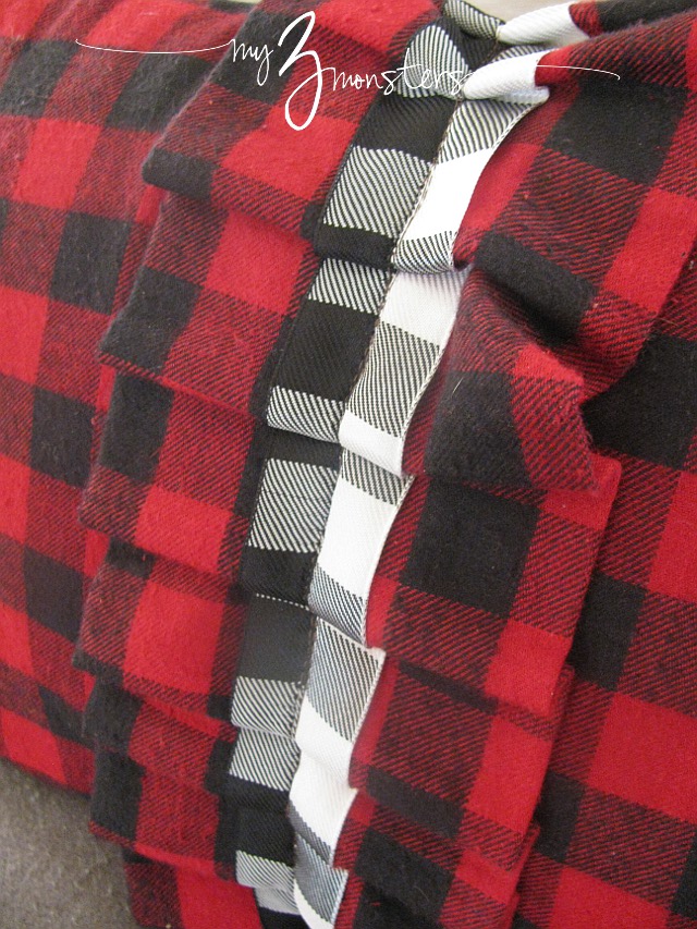 The fabric itself is pretty masculine so I wanted to add a girly touch with a ruffle right down the front. I followed the same basic process that I used for this ruffled pillow cover in Sis's room. The only difference is that I used black and white buffalo check ribbon for the small ruffle and pleated, rather than gathered, the strips.