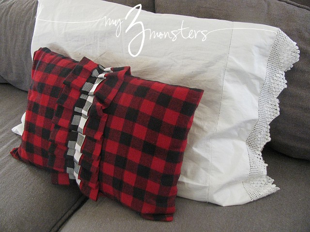 I just cut the back end of the pillow case off to make it short enough to fit my big throw pillows and stitched some ribbon ties under the lace on the open end to keep it closed. It adds another little feminine touch and the lace reminds me of the snowflakes on our tree. {I get all happy inside when things tie together like that!}