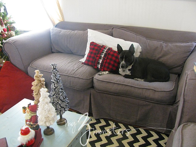 Cassie has adopted this spot on the couch {and that plaid pillow} as her own. Yes, she thinks she's a person and sleeps with her head on a pillow. Lest you fear for those vintage lace pillow cases, she is probably cleaner and way more gentle with my things in the living room than my children are. {But I usually move those special ones out of the way when she's laying down, just in case.}