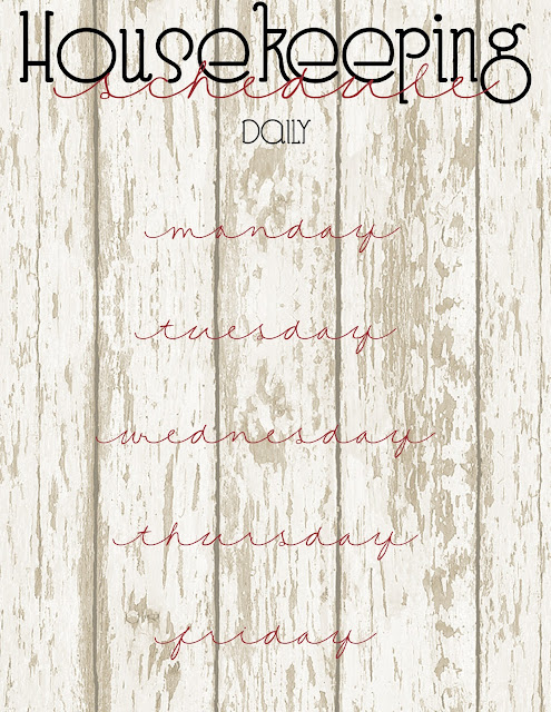 But I still believe in the system. This plan really worked for me when I was working it. Recently I decided to revisit {and slightly revise} my housekeeping plan for a new year. I got so tired of always "putting out fires" around my house -- quickly making my house appear to be clean from a distance -- and never getting on top of things and actually having a clean house. I was fed up with having my master bedroom be the dumping ground for all the crap that we frantically shoveled out of the main living areas as people walked up to our front door.