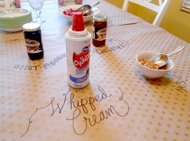 {I had a hard time getting good, crisp pictures of excited little ice cream eating bodies. At lest they were having fun, right?!} I did decorate the tiniest little bit. I rolled out some kraft paper gift wrap on the table and labeled the ice cream and toppings with a Sharpie.
