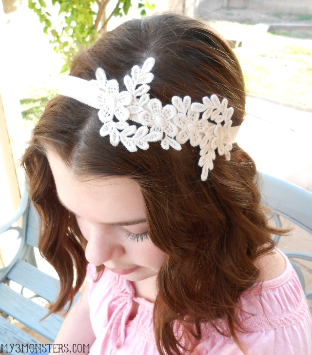Once you have a configuration you like, lay your ribbon flat on a piece of wax paper. Attach the lace pieces to the ribbon using craft or fabric glue. The glue dries clear so you don't have to worry too much, but try to use small dots to avoid turning your headband into a giant glue-bomb. Allow the glue to dry completely and you're finished!