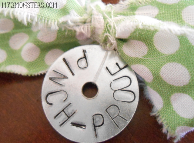 If you have boys, you could stamp the washer and fill in the grooves with green Sharpie. Then just hang the washer from a simple ball chain necklace or piece of green baker's twine that fits over their head for a simple way to keep pinchy-fingers at bay!