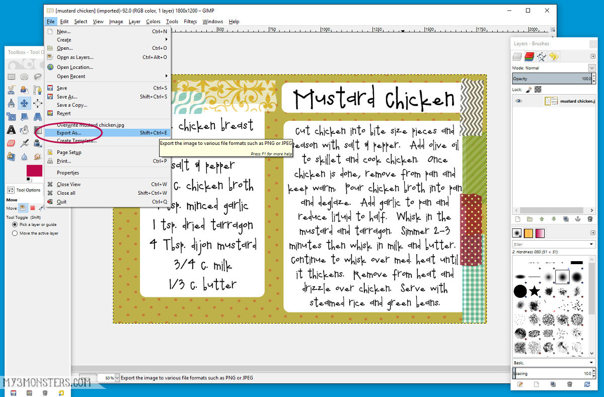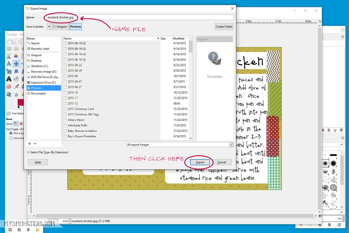 Repeat those steps to add the rest of your text. Any time you use a different font, want text to be a different size to stand out, or want more text in a different location, you will need to create a different text box. You can create as many different text boxes as you need on an image. When you have everything exactly the way you want it, it’s time to save it. The thing you need to know is that in Gimp, “saving” for printing is called “exporting”. Click on FILE in the upper corner again, then choose “EXPORT AS”. Do not choose “Save As” or “Save” – that is something else. This will open up a box that allows you to rename the file and choose where to save it to your computer.